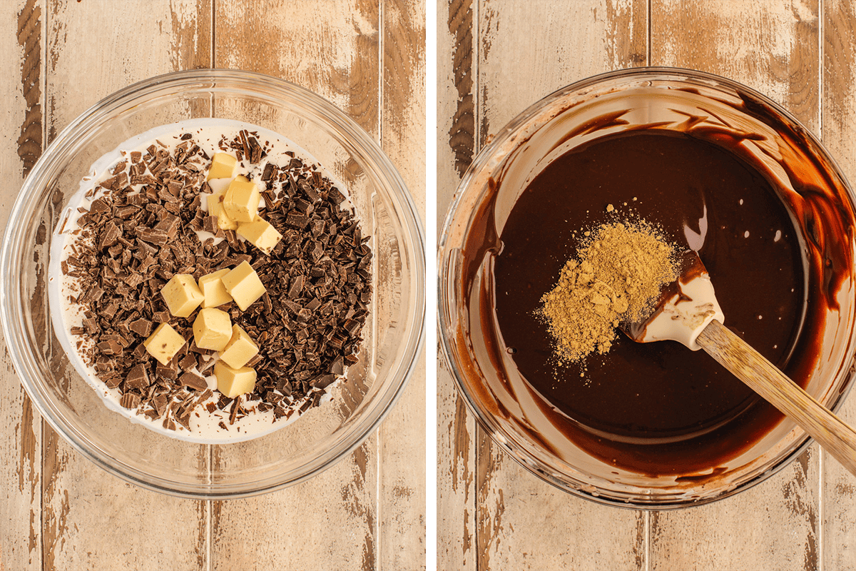 • Add the heavy cream, darkish chocolate, milk chocolate, butter, and floor ginger to a big microwave-safe bowl.