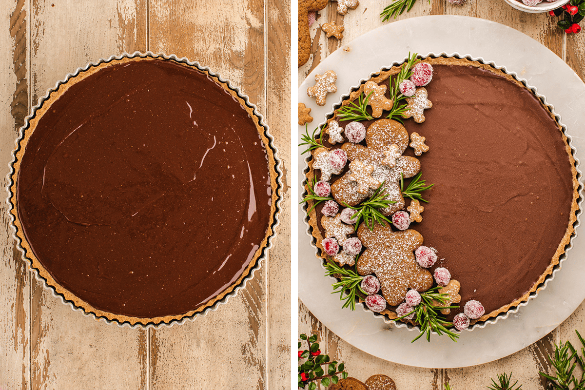 This Christmas dessert combines two vacation favorites – gingerbread cookies and a chocolate tart – into one unforgettable centerpiece. Topped with selfmade gingerbread males cookies and sugared cranberries.