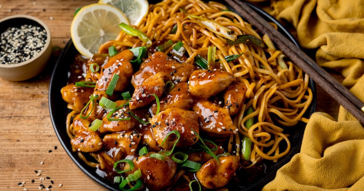 A warming takeout-style meal of rooster breast items with a lightweight crispy coating smothered in a tangy lemon and black pepper sauce. Served up with stir fried noodles.
