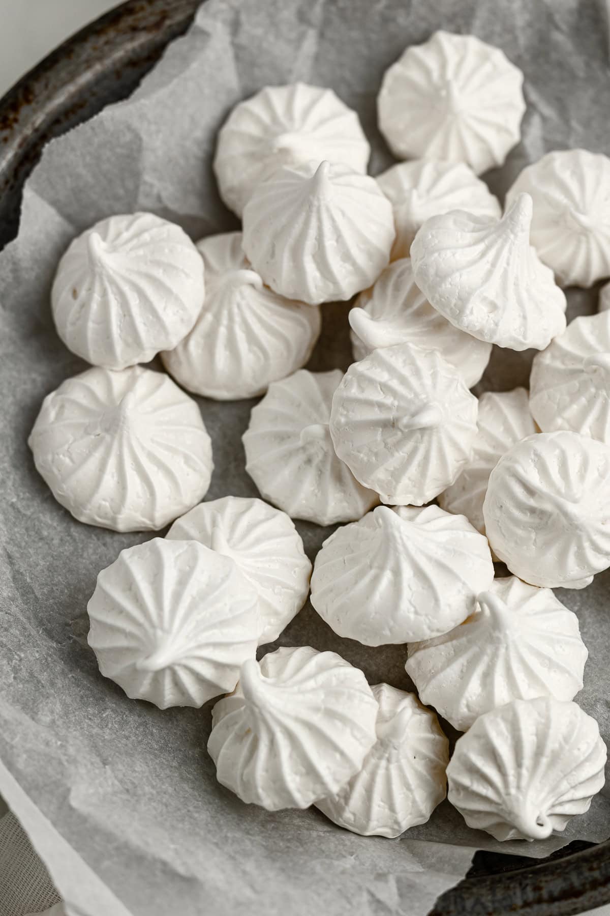 several white piped small meringue cookies in a bowl lined with white parchment paperseveral white piped small meringue cookies in a bowl lined with white parchment paper