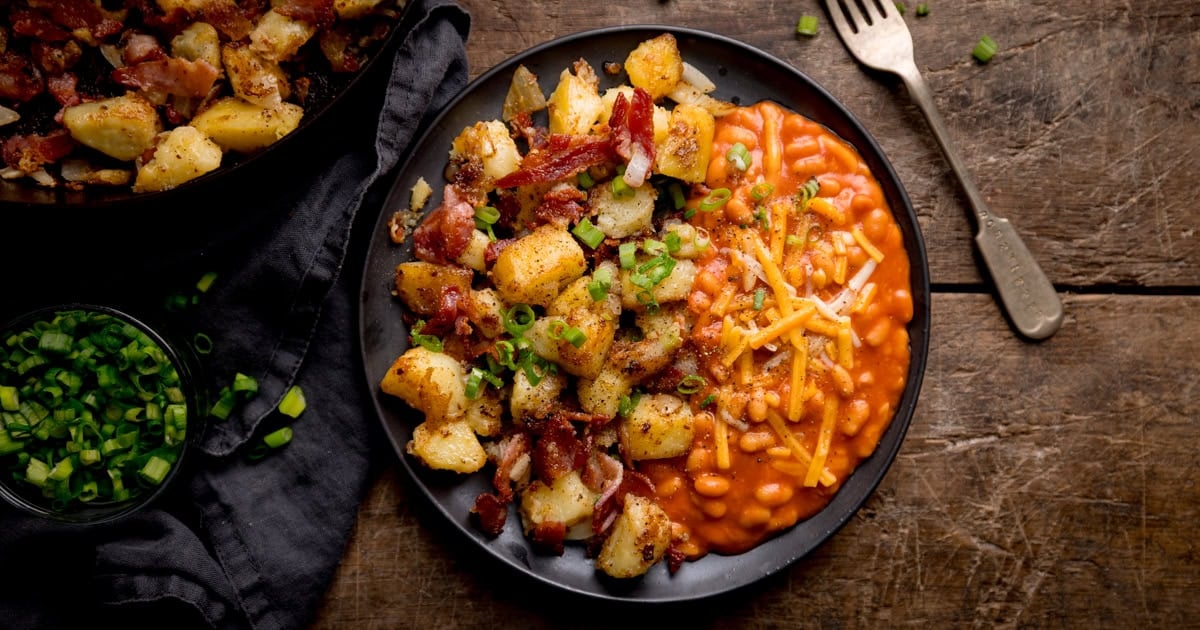 Parboil diced potatoes, crisp up bacon, then pan-fry the potatoes within the bacon fats with onion and seasonings till golden; chop the bacon and toss again by way of. Heat baked beans with smoked paprika and white pepper, stir in cheese, then serve alongside the hash with a sprinkle of spring onions and black pepper.