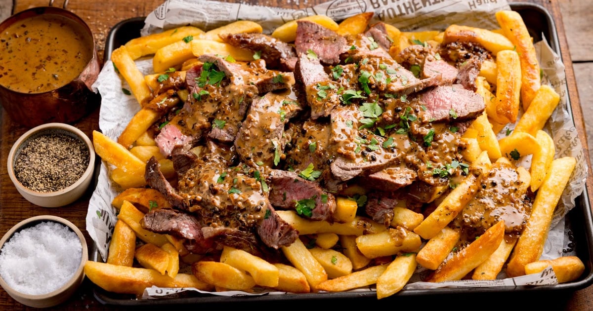 Strips of steak piled on prime of pretty fats chips and smothered in peppercorn sauce. A particular deal with household dinner that’s requested time and again.